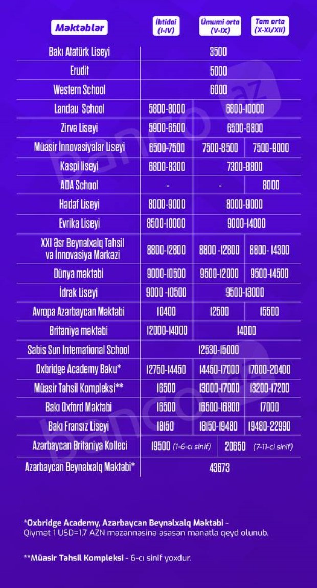 Azərbaycanda təhsil almaq üçün kifayət qədər dövlət və özəl məktəblər var. Dövlət məktəblərində təhsil pulsuzdur. Ödənişli təhsil verən lisey və məktəblərdə isə qiymətlər məktəbdəki tədris dilinə, məktəbin yerləşdiyi ünvana, nəqliyyat xərclərinə, dərs vəsaitlərinə, qidalanma, məşğələlər, müəllimin yerli və ya xarici olmasına və təhsil pilləsinə görə fərqlənir.