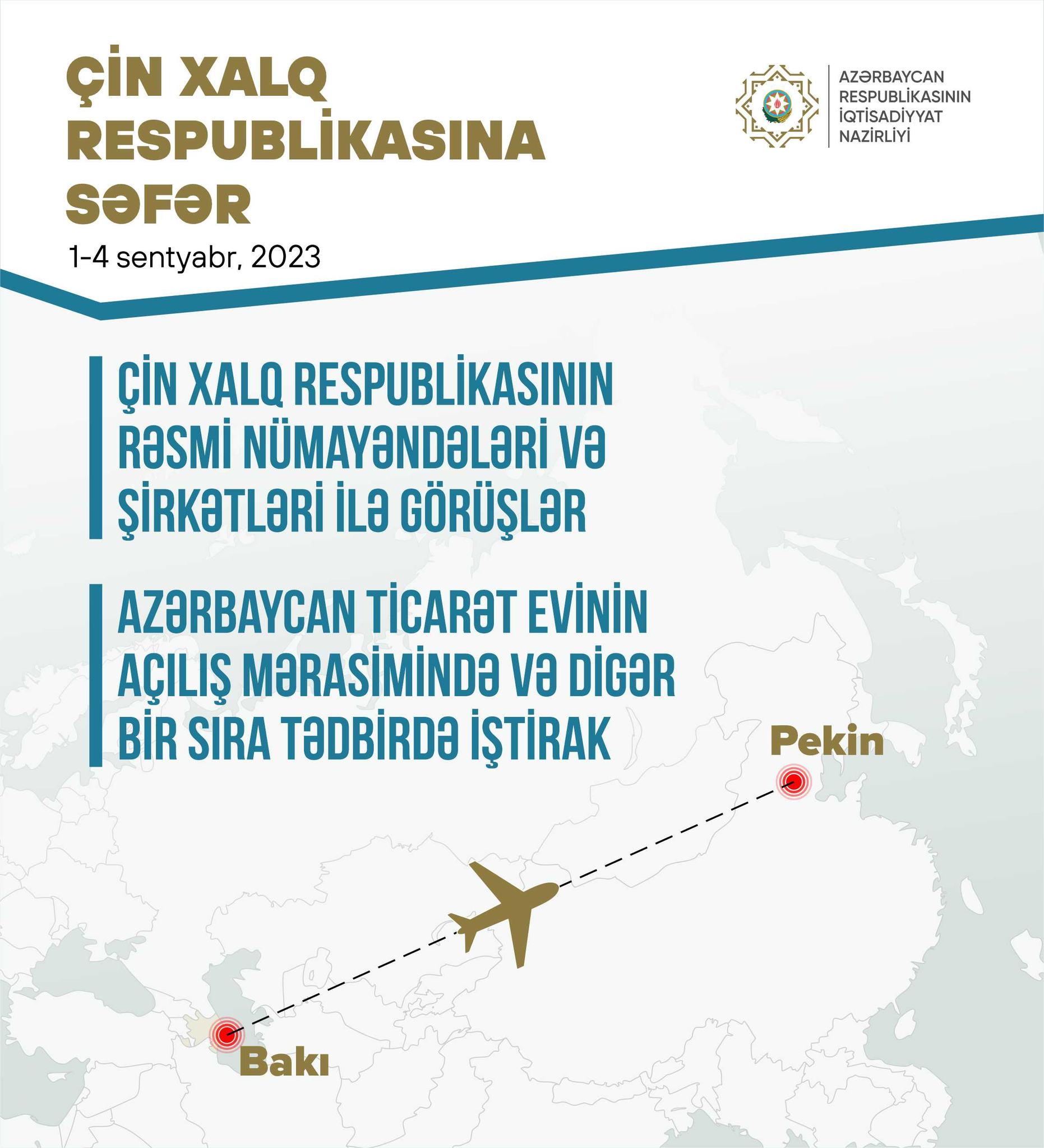 "Həmkarlarla birgə Çin Xalq Respublikasına səfərimiz çərçivəsində bir sıra rəsmi nümayəndələr və şirkət rəhbərləri ilə görüşlər keçirəcəyik. Pekində Azərbaycan Ticarət Evinin açılış mərasimində və digər tədbirlərdə iştirak edəcəyik",- nazir bildirib.