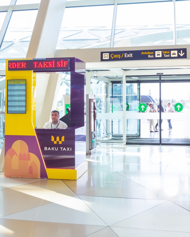 "Rəsmi taksilər şəffaf tariflər təqdim edirlər".Heydər Əliyev Beynəlxalq Aeroportu sərnişinlərin və ziyarətçilərin təhlükəsizliyini və rahatlığını təmin etmək məqsədilə hava limanının ərazisində yalnız rəsmi taksilərdən istifadə etməyi tövsiyə edir. Lisenziyasız taksi xidmətlərindən istifadə qiymətlərin şişirdilməsi, aşağı xidmət keyfiyyəti, hətta dələduzluq və ya oğurluq kimi arzuolunmaz hallara gətirib çıxara bilər.