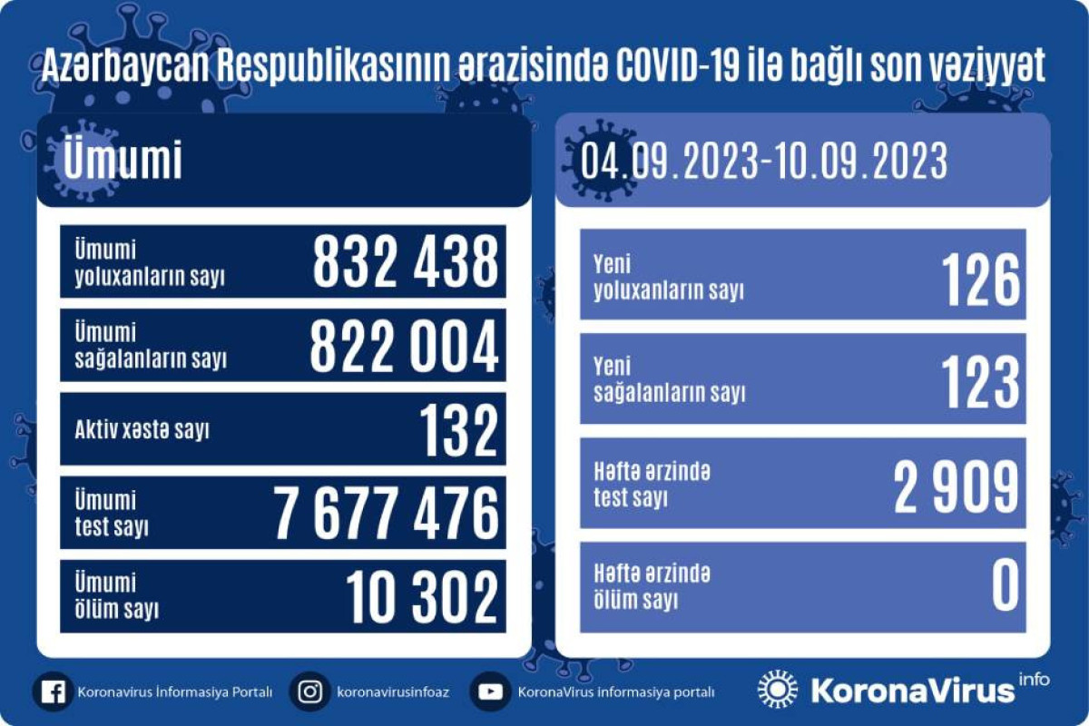Azərbaycanda koronavirus (COVID-19) infeksiyasına son 1 həftədə (04.09.2023-10.09.2023) 126 yeni yoluxma faktı qeydə alınıb, 123 nəfər müalicə olunaraq sağalıb.