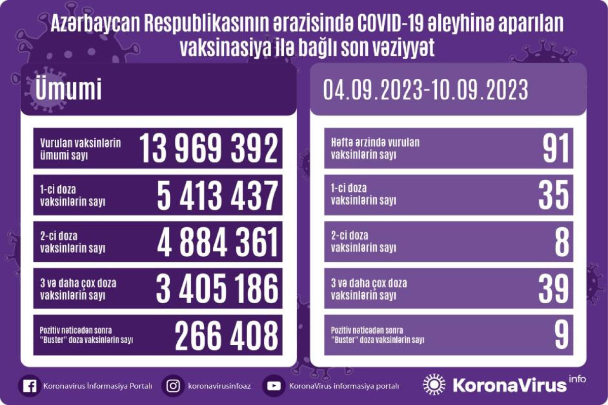 Ölkədə vurulan vaksinlərin ümumi sayı 13 969 392, birinci mərhələ üzrə vaksinasiya olunanların ümumi sayı 5 413 437, ikinci mərhələ üzrə vaksinasiya olunanların sayı 4 884 361, üç və daha çox doza vaksin vurduranların sayı 3 405 186, pozitiv nəticədən sonra buster doza üzrə vaksinasiya olunanların sayı isə 266 408 təşkil edir.