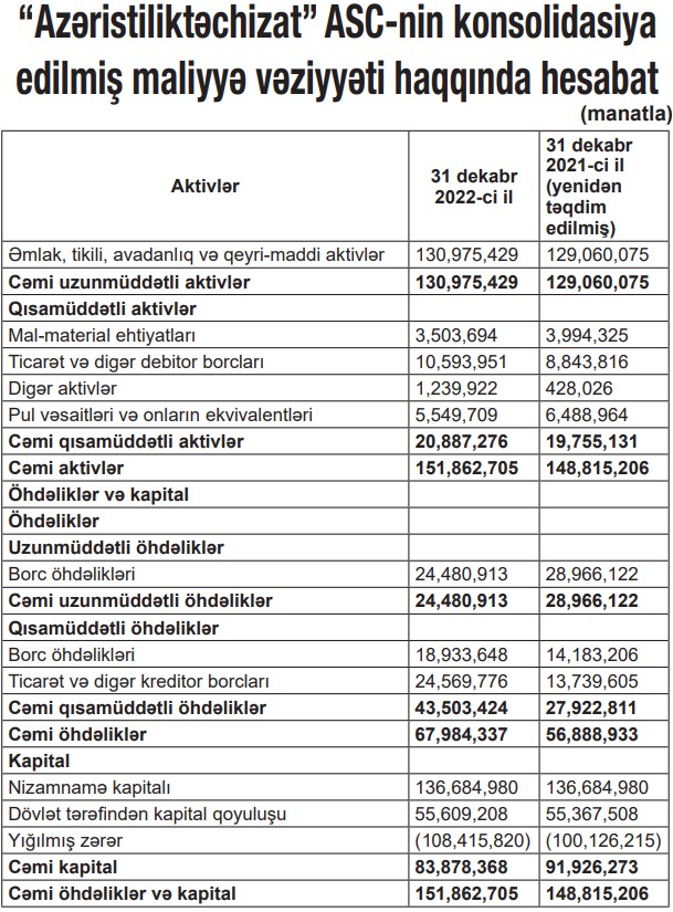 Marja.az ASC-nin konsolidasiya edilmiş maliyyə vəziyyəti haqqında hesabatına istinadən xəbər verir ki, 31 dekabr 2022-ci il tarixində yığılmış zərər 108 milyon 416 min manat təşkil edib. 2021-ci ilin sonunda “Azəristiliktəchizat”ın yığılmış zərəri 100 milyon 126 min manat olmuşdu.