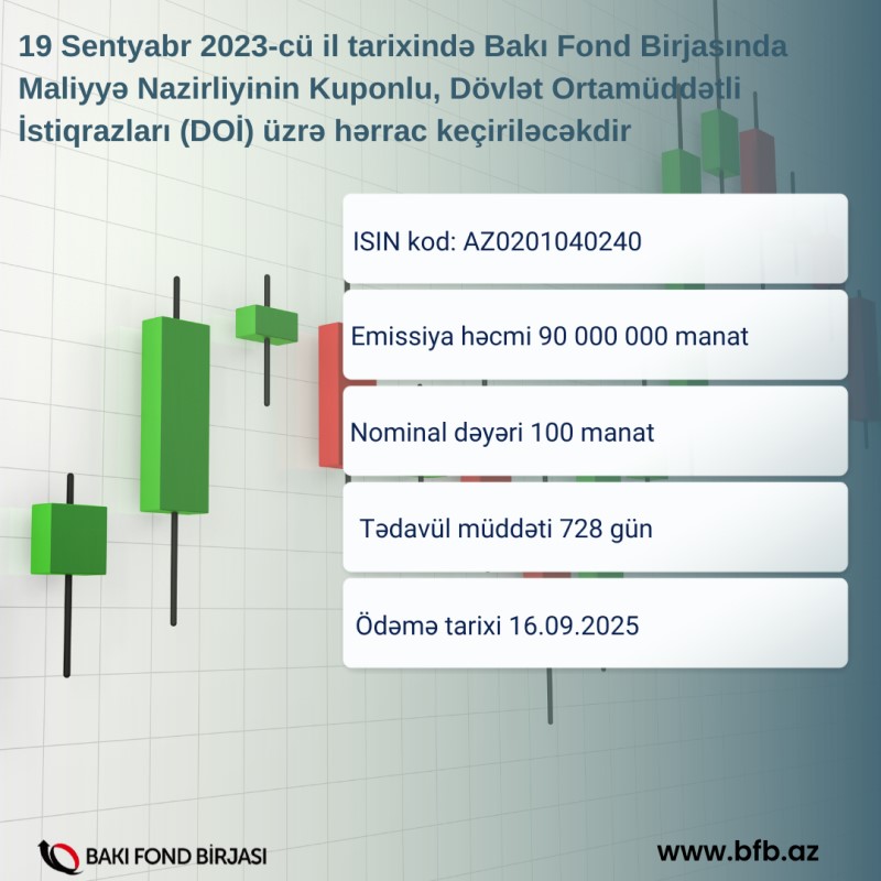 19 sentyabr 2023-cü il tarixində Bakı Fond Birjasında Maliyyə Nazirliyinin Kuponlu, Dövlət Ortamüddətli İstiqrazları (DOİ) üzrə hərrac keçiriləcəkdir. Hərrac zamanı sifarişlərin toplanması BFB-nin ticarət reqlamentinə uyğun olaraq saat 10:00-dan 11:00-dək təşkil olunacaqdır.