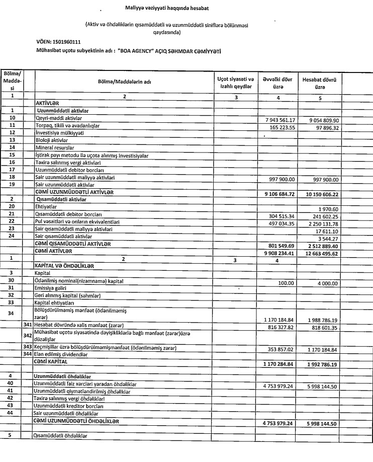 "BOA Agency" ASC 2020-ci ildə 321 min manat, 2021-ci ili 471 min manat, 2022-ci ili 1 milyon 20 min manat xalis mənfəət ilə başa vurmuşdu. Ötən il "BOA Agency"nın cəmi aktivləri də 2 dəfədən çox artaraq 9 milyon 908 min manata çatmışdı.
