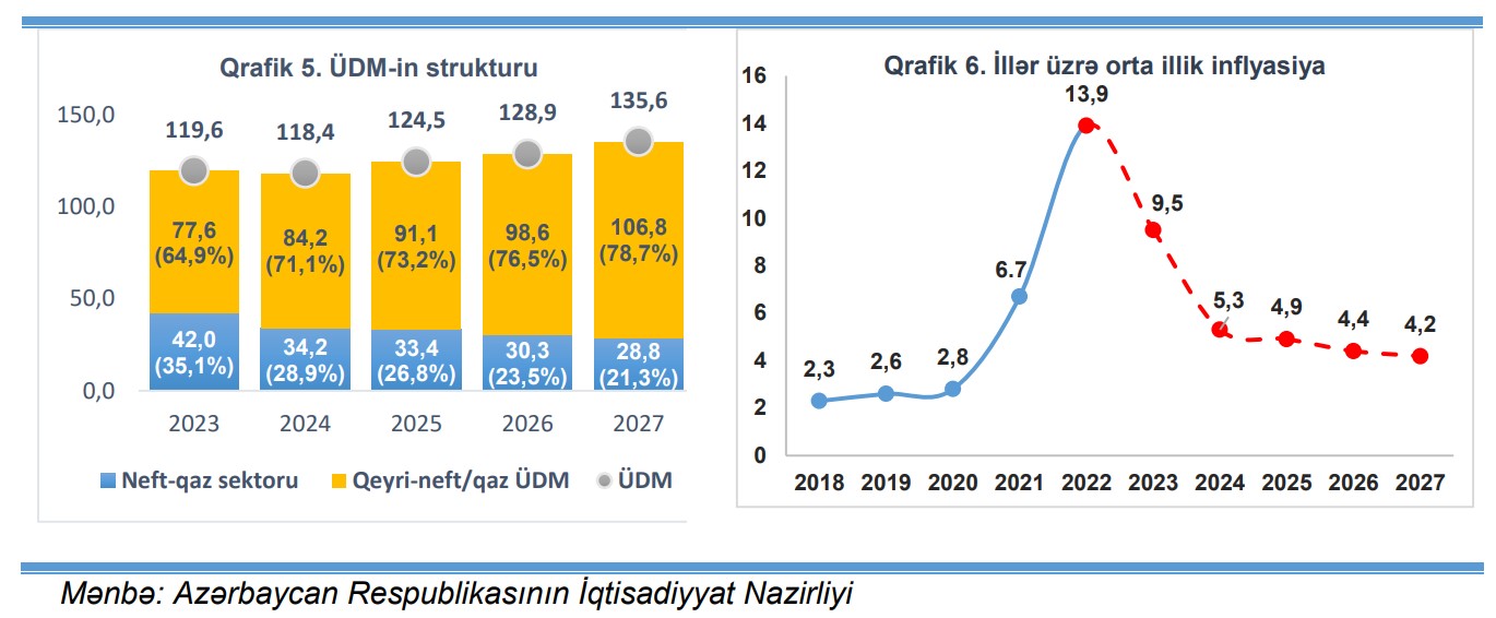 Qeyd edilib ki, proqnozlara əsasən ortamüddətli dövrdə ölkədə qeyri-neft/qaz ÜDM-in həcminin 2024-cü ilin sonuna 84,2 milyard manat, 2027-ci ildə isə 106,8 milyard manata qədər artacağı və real artım tempinin 4,6-5,0 faiz intervalında olacağı gözlənilir.