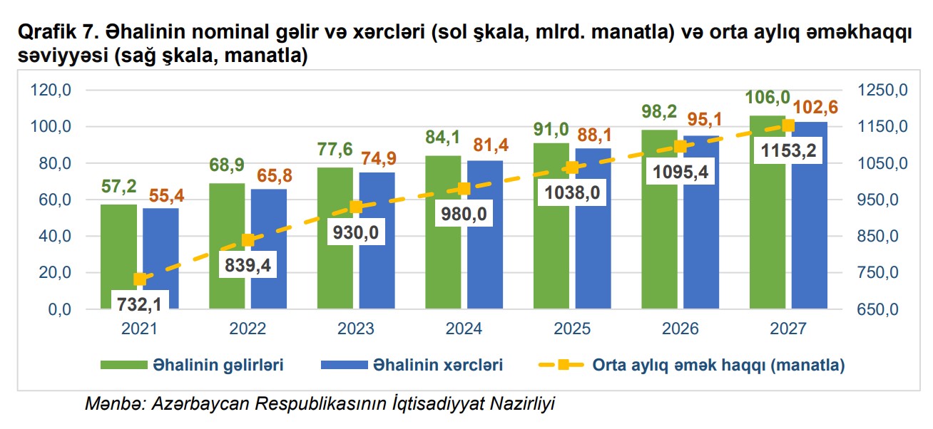 İnflyasiya mühitinin tənzimlənməsi ilə bağlı atılan addımlar iqtisadi fəallığın artımı ilə yanaşı əhalinin sosial rifahına da müsbət təsir edəcəkdir. Proqnozlara əsasən ortamüddətli dövrdə əhalinin gəlirlərinin artaraq 2027-ci ildə 106,0 milyard manata, xərclərinin isə 102,6 milyard manata qədər yüksəlməsi gözlənilir.