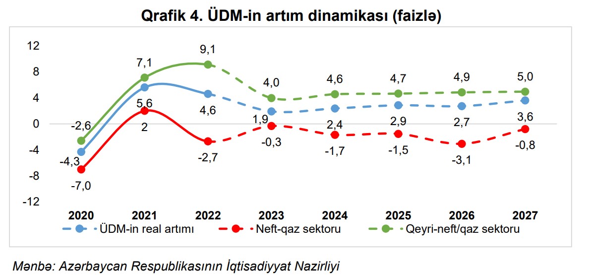 Azərbaycan Respublikasının İqtisadiyyat Nazirliyi tərəfindən hazırlanmış 2024-cü il və sonrakı üç il üzrə baza ssenaridə (neftin bir barelinin orta illik ixrac qiyməti 2024-2027-ci illər üçün 60,0 ABŞ dolları fərz edilməklə) makroiqtisadi proqnoz göstəricilərinə əsasən, 2023-cü ildə ölkədə ümumi daxili məhsulunun (ÜDM) real ifadədə 1,9 faiz artaraq 119,6 milyard manat, o cümlədən qeyrineft/qaz ÜDM-in real ifadədə 4,0 faiz artaraq 77,6 milyard manat təşkil edəcəyi proqnozlaşdırılır. 2023-cü ildə neft-qaz sektoru üzrə ÜDM-in real ifadədə 0,3 faiz azalacağı gözlənilir.