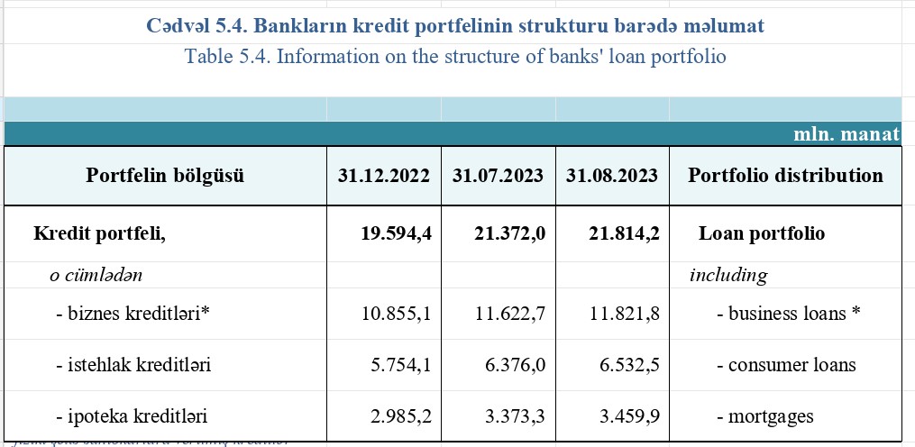 Azərbaycan banklarının cəmi kredit portfeli (müştərilərə verilmiş kreditlər) 2023-cü ilin iyul ayının sonu ilə müqayisədə avqust ayında 442,3 milyon manat artaraq 31 Avqust 2023-cü il tarixində 21 milyard 814,2 milyon manat təşkil edib.