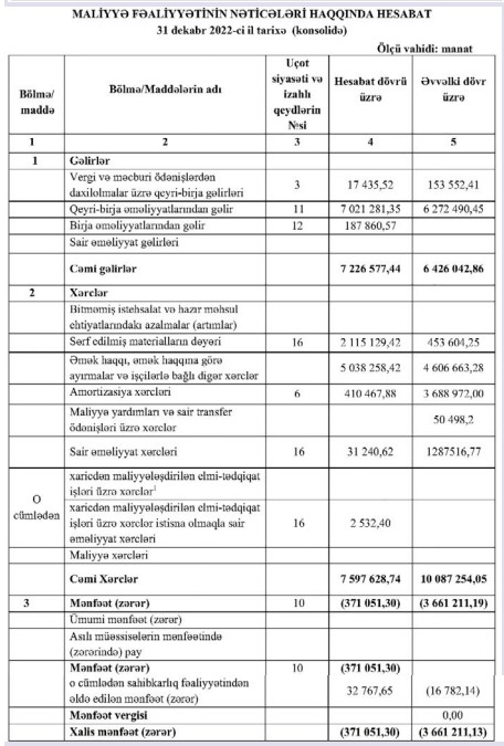 "Azərbaycan Yaşıllaşdırma və Landşaft" ASC 2022-ci ili 371 min manat xalis zərər ilə başa vurub. Şirkət 2021-ci 3 milyon 661 min manat xalis zərər ilə başa vurmuşdu.