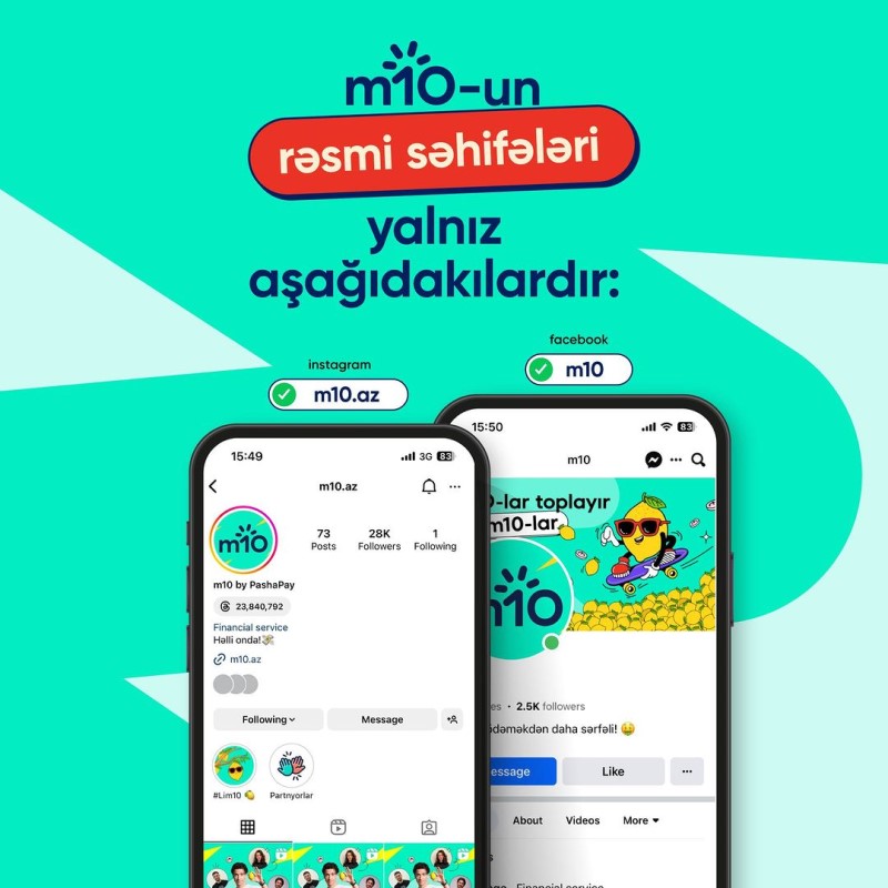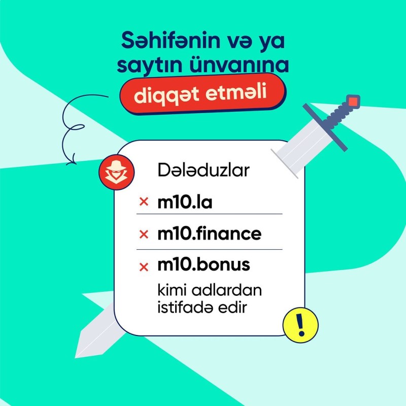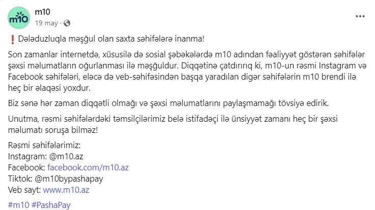 Qeyd edək ki, bir müddət əvvəl “m10” MMC də rəsmi məlumat yayaraq müştərilərini dələduzluq faktları ilə bağlı xəbərdarlıq etmişdi. Şirkət vətəndaşları şəxsi məlumatlarını paylaşmamağa çağırmışdı. Eyni zamanda qeyd edilmişdi ki, “m10”un təmsilçilərinin belə müştərilərin heç bir şəxsi məlumatını soruşmaq kimi hüququ yoxdur.