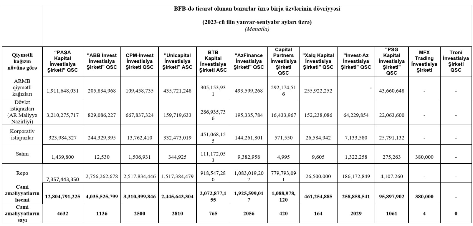 Marja.az Birjaya istinadən xəbərverir ki, “PAŞA Kapital İnvestisiya Şirkəti” QSC 12 milyard 804 milyon 791 min 225 manat dövriyyə ilə 1-ci, "ABB İnvest İnvestisiya Şirkəti" QSC 4 milyard 35 milyon 525 min 799 manat dövriyyə ilə 2-ci, "CPM-İnvest İnvestisiya Şirkəti"QSC 2 milyard 517 milyon 834 min 446 manat dövriyyə ilə 3-cü, "Unicapital İnvestisiya Şirkəti" ASS 1 milyard 517 milyon 384 min 479 manat dövriyyə ilə 4-cü yeri tutub. Bu şirkətlərin dövriyyələrə 1 milyard manat səviyyəsindən yüksək olub.