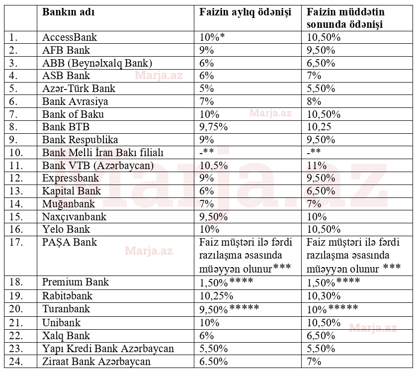 - Cədvəldə; faizlərin "hər ay" və "müddətin sonunda" götürülməsindən asılı olaraq 1 illik (12 ay) qəbul edilən Manat əmanətinin faizləri göstərilib.