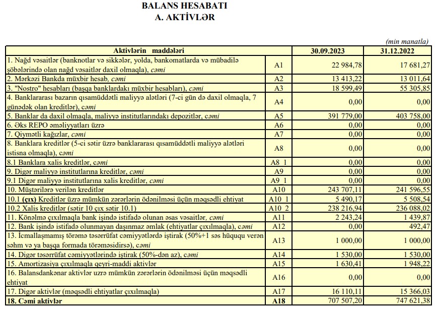 30 sentyabr 2023-cü il tarixində "Azərbaycan Sənaye Bankı" 707 milyon 507 min manat cəmi aktivlərə malik olub ki, bu da ötən ilin sonu ilə müqayisədə 40 milyon 114 min manat azdır. Eyni dövrdə Bankın kredit portfeli (müştərilərə verilmiş kreditlər) 2 milyon 111 min manat azalaraq 243 milyon 707 min manata, digər banklarda yerləşdirilmiş depozitlər isə 11 milyon 979 min manat azalaraq 391 milyon 779 min manata düşüb.