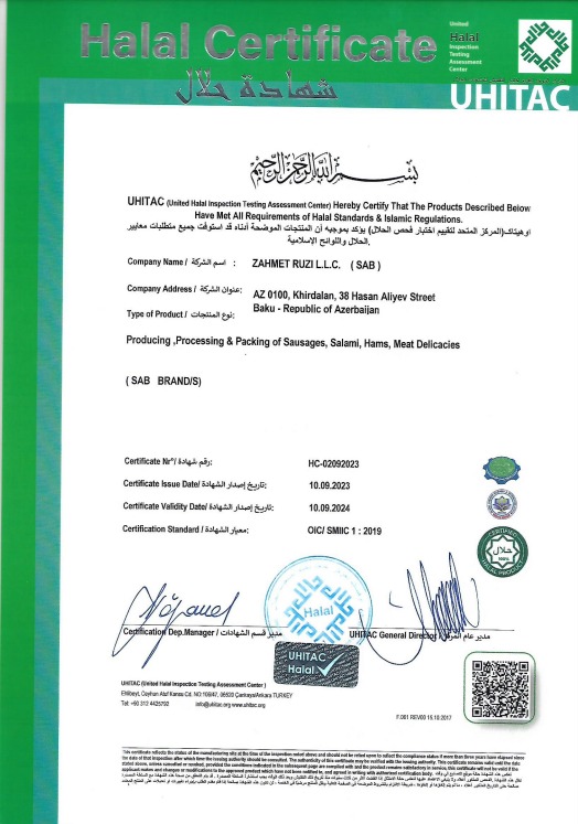 "UHITAC heç bir maraq və ya gözlənti olmadan beynəlxalq standartlara uyğun müstəqil, qərəzsiz qlobal halal sertifikatlaşdırma mərkəzidir və İslam Palatasının Araşdırma və İnformasiya Mərkəzinin rəsmi nümayəndəsidir. 2008-ci ildən milli və beynəlxalq arenada fəaliyyət göstərən şirkət Türkiyə, Azərbaycan, Kipr və bəzi Balkan ölkələrindəki şirkətlərin məhsullarının halallıq yoxlamalarını həyata keçirir və eyni zamanda sertifikatlaşdırır. Əlavə olaraq da qeyd edək ki, "SAB"eyni zamanda milli Halallıq sertifikatı ilə də təltif edilmişdir. Azərbaycanda ilk halal məhsulların və xidmətlərin sertifikatlaşdırma xidmətini göstərən Halal Kontrol Qrup mərkəzi "SAB"da beynalxalq halal qida standartlarına uyğun sistemlərin qurulması, halal qida qatqılarından istifadə edilməsi, habelə halal xammaldan istifadə edilməsi ilə bağlı yoxlamalar həyata keçirdikdən sonra seçilmiş məhsulların halallığının isbatı olaraq Halallıq Sertifikatı təqdim edilmişdir.