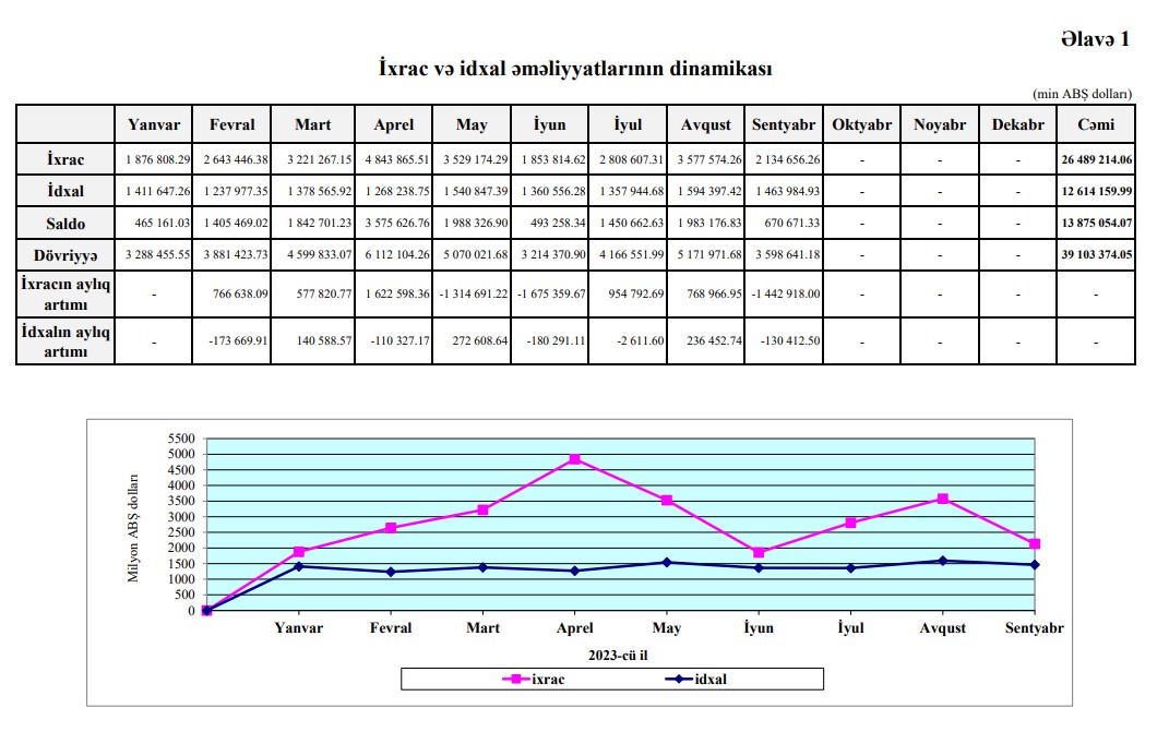 2023-cü ilin yanvar-sentyabr dövründə ixrac 26 milyard 489 milyon 214 min dollar, idxal 12 milyard 614 milyon 159 min dollar, müsbət saldo müsbət 13 milyard 875 milyon 54 min dollar olub.