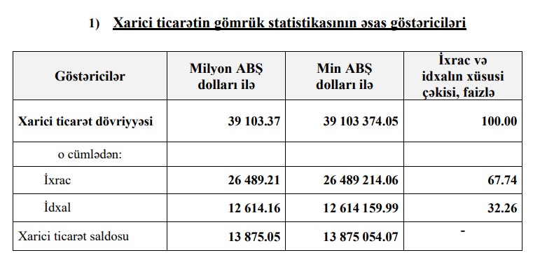 Xarici ticarətin gömrük statistikasının əsas göstəriciləri açıqlanıb.