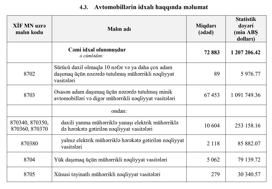 2023-cü ilin 9 ayında (yanvar-sentyabr) Azərbaycan 1 milyard 207 milyon 206 min dollar dəyərində 72 min 883 ədəd avtomobil (nəqliyyat vasitələri) idxal olunub.