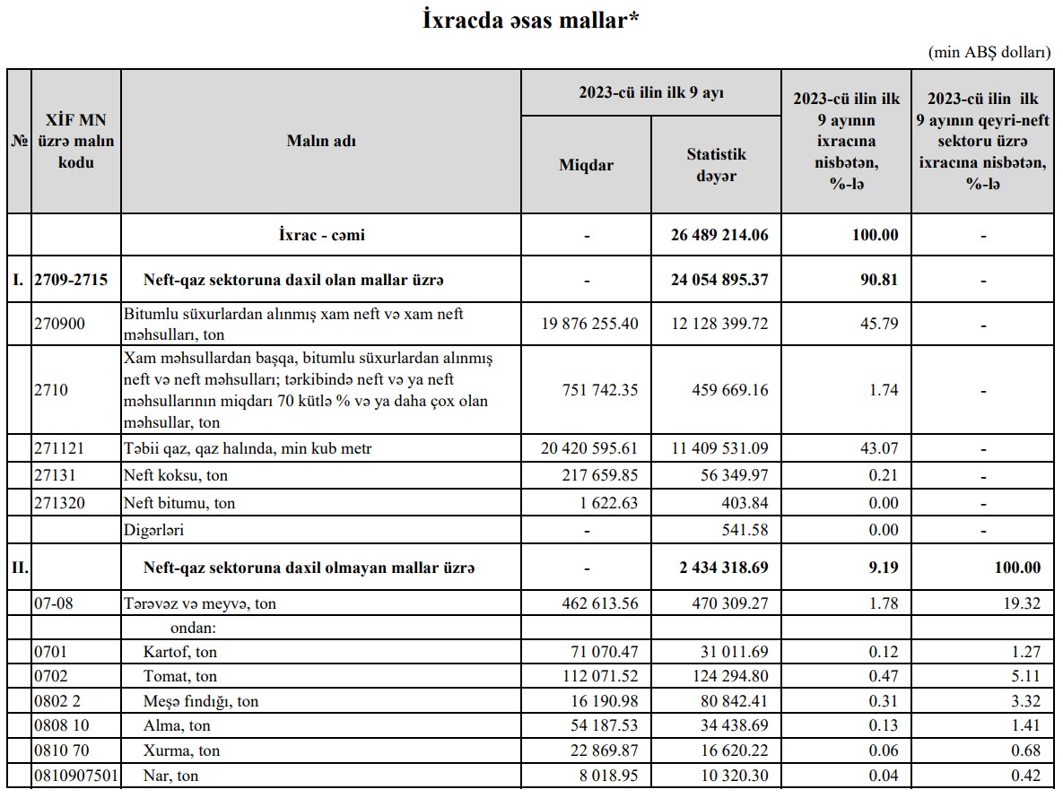 2023-cü ilin ilk 9 ayı ərzində (yanvar-sentyabr) Azərbaycandan 24 milyard 54 milyon 895 min dollar dəyərində (41 milyard 893 milyon manat) neft-qaz sektoruna daxil olan mallar ixrac olunub ki, bu da ötən ilin eyni dövrü ilə müqayisədə 3 milyard 349 milyon 465 min dollar azdır. Ötən ilin eyni dövründə Azərbaycandan 27 milyard 404 milyon 360 min dollarlıq neft-qaz sektoruna daxil olan mallar ixrac edilmişdi.