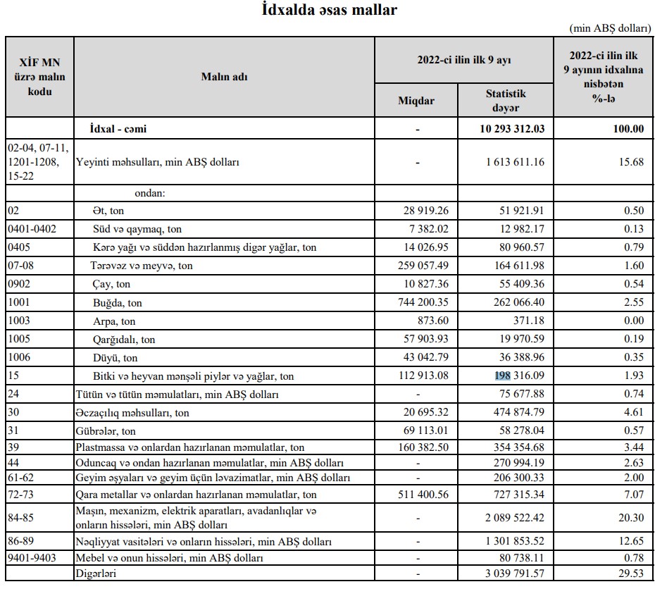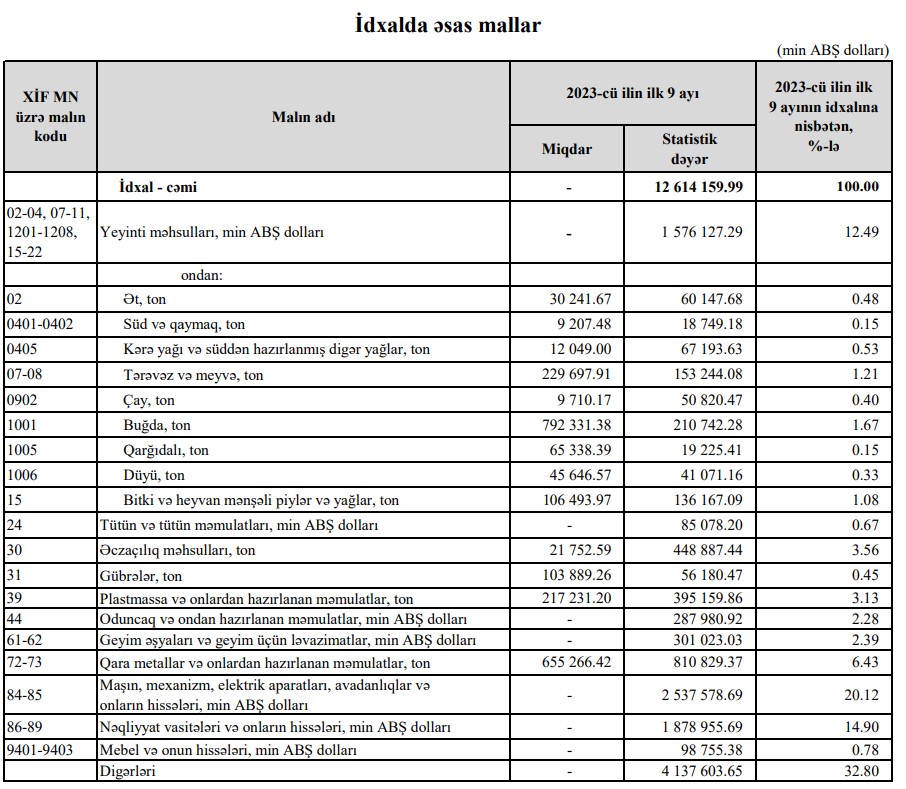 Yeyinti məhsullarının cəmi idxal dəyərinin azalması buğda, kərə, bitki yağılarının, meyvə-tərəvəzin idxal dəyərinin aşağı düşməsilə əlaqədardır. Belə ki, Azərbaycana 2022-ci ilin 9 ayında 262 milyon 66 min dollar dəyərində 744 min 200 ton buxda idxal olunmuşdursa, 2023-cü ilin 9 ayında 210 milyon 742 min dollar dəyərində 792 min 331 ton buğda idxal olunub. Həmçinin, 2022-ci ilin 9 ayında 198 milyon 316 min dollarlıq 112 min 913 ton bitki yağları idxal olunmuşdursa, 2023-cü ilin 9 ayında 136 milyon 167 min dollar dəyərində 106 min 493 ton bitki yağları idxal olunub.