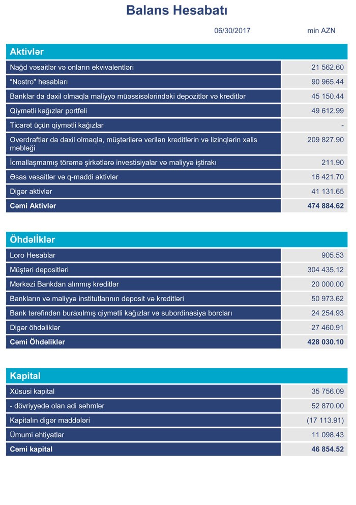 31 Mart 2017-ci il tarixində Bankda Mərkəzi Bankdan alınmış kreditlər 60 milyon manat idi.