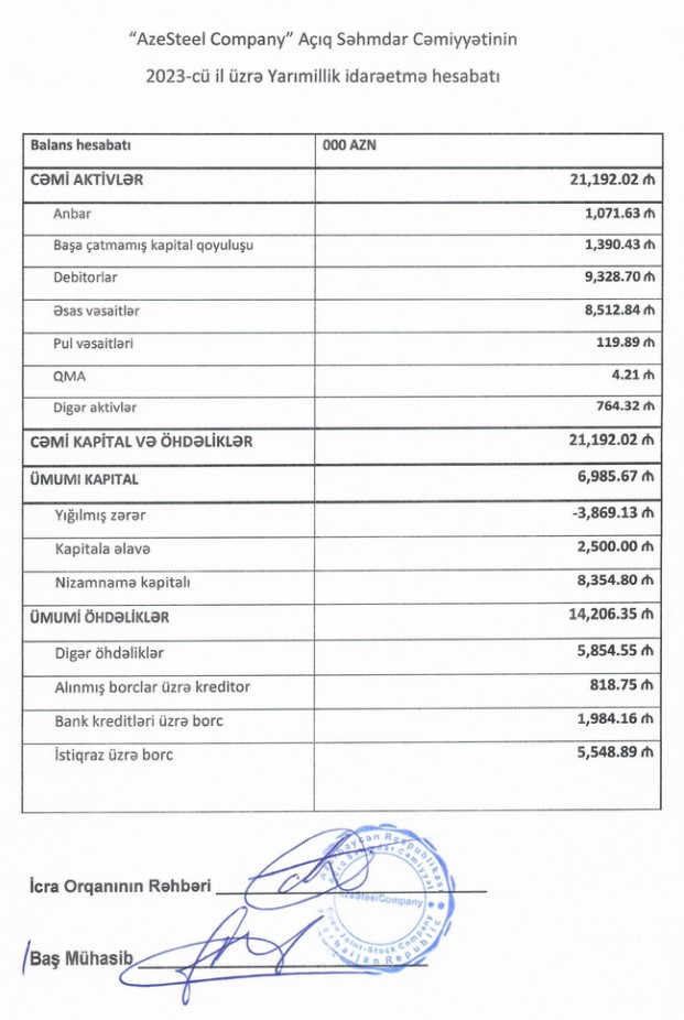 30 İyun 2023-cü il tarixində "AzeSteelCompany" şirkətinin yığılmış zərəri 3 milyon 869 min manata çatıb və 10 milyon 854 manat cəmi kapitalını azaldaraq 6 milyon 985 min manata düşməsinə səbəb olub.