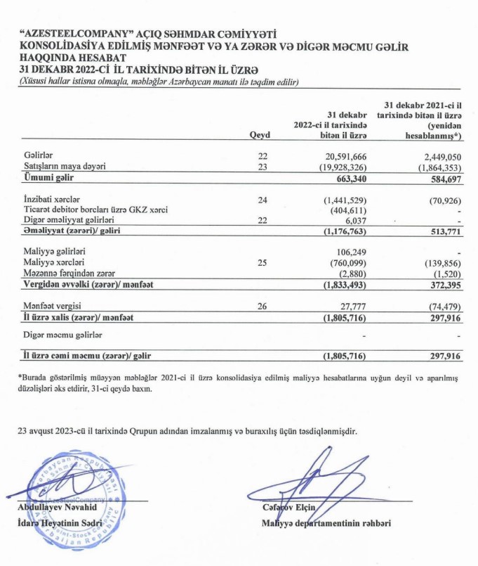 "AzeSteelCompany" 2022-ci ili 1 milyon 806 min manat xalis zərər ilə bağlamışdı.