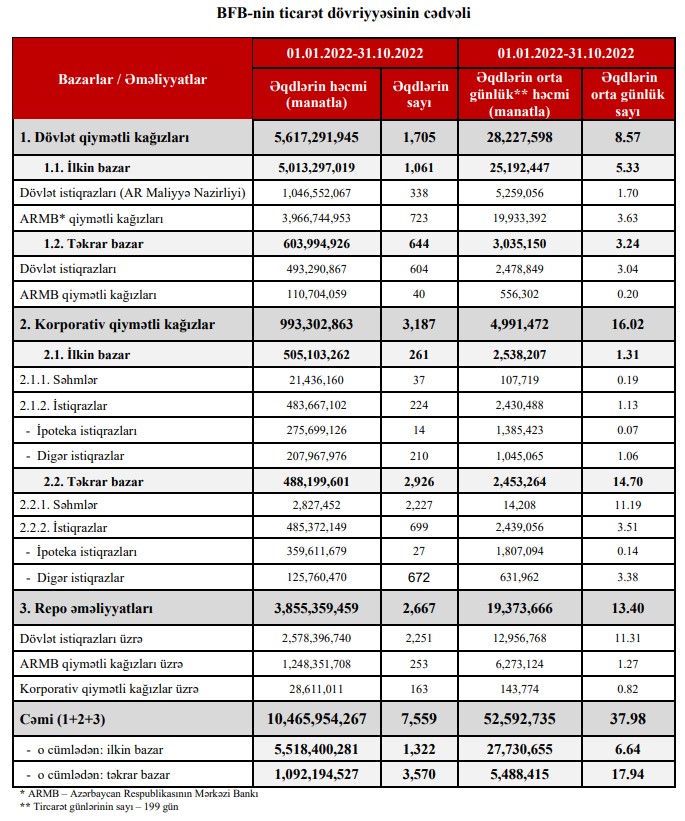 Bakı Fond Birjasında 01.01.2022-31.10.2022 tarixləri ərzində qiymətli kağızlar üzrə keçirilən əməliyyatların ümumi həcmi 10 milyard 465 milyon 954 min manat təşkil etmişdi.
