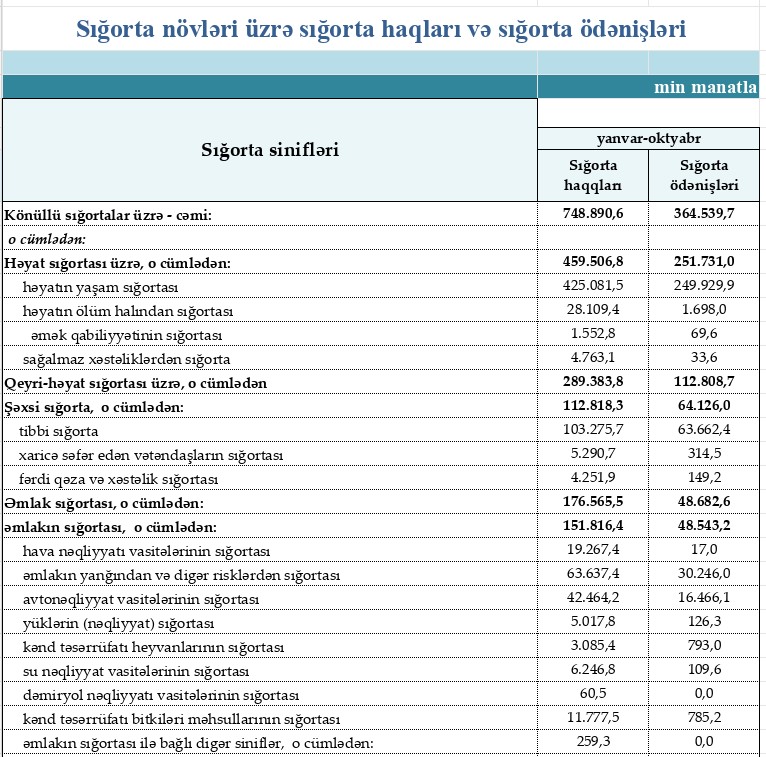 Azərbaycan Mərkəzi Bankı 2023-cü ilin yanvar - oktyabr ayları üzrə hesablanmış sığorta haqları və sığorta ödənişləri barədəməlumatları açıqlayıb.