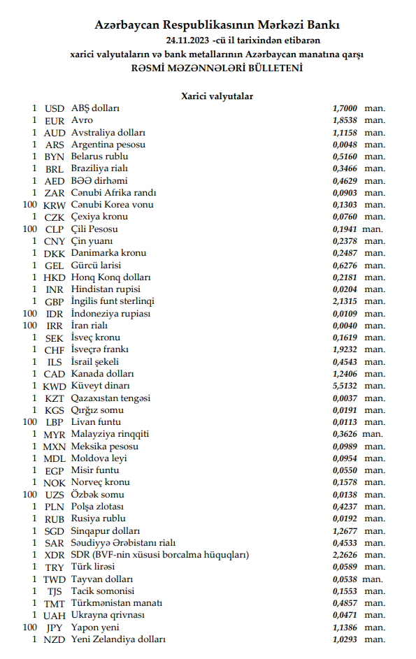 Rəsmi məzənnələr açıqlandı