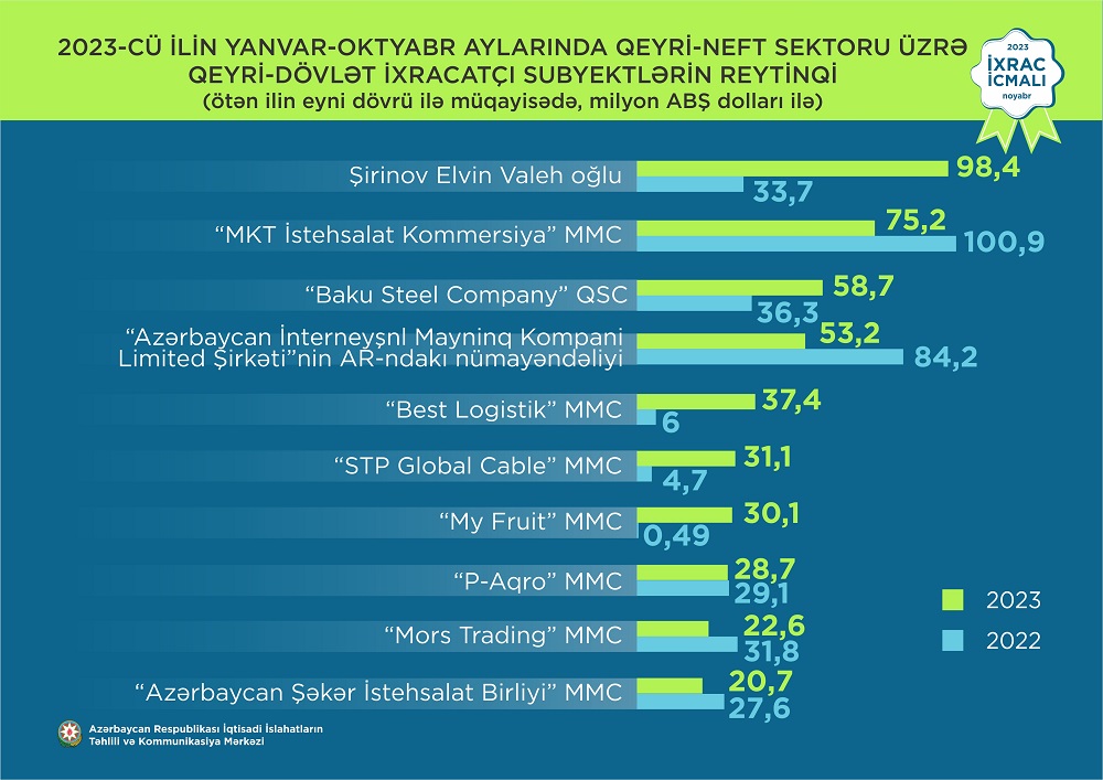 2023-cü ilin oktyabr ayında qeyri-neft sektoruna aid ən çox mal ixrac edilən ölkələrin siyahısında Rusiya Federasiyası (94,1 milyon ABŞ dolları) birinciliyə yüksəlib. Bu siyahıda Türkiyə (44,1 milyon ABŞ dolları) ikinci və Gürcüstan (26 milyon ABŞ dolları) üçüncü olub.