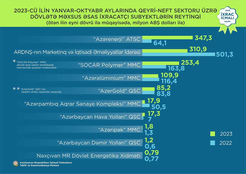 2023-cü ilin yanvar-oktyabr ayları ərzində Rusiya Federasiyasına 881,4 milyon ABŞ dolları, Türkiyəyə 675,9 milyon ABŞ dolları, Gürcüstana 266,3 milyon ABŞ dolları, İsveçrə Konfederasiyasına 129,8 milyon ABŞ dolları, Qazaxıstana isə 84,2 milyon ABŞ dolları dəyərində qeyri-neft sektoruna aid mal ixrac olunub.