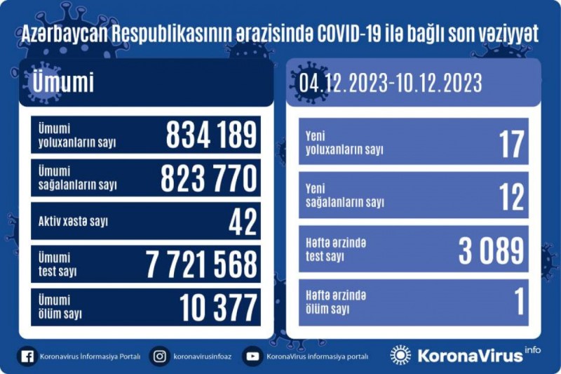 Azərbaycanda son 1 həftədə 17 nəfər COVID-19-a yoluxub, 1 nəfər ölübAzərbaycanda koronavirus (COVID-19) infeksiyasına son 1 həftədə (04.12.2023-10.12-2023) 17 yeni yoluxma faktı qeydə alınıb, 12 nəfər müalicə olunaraq sağalıb.