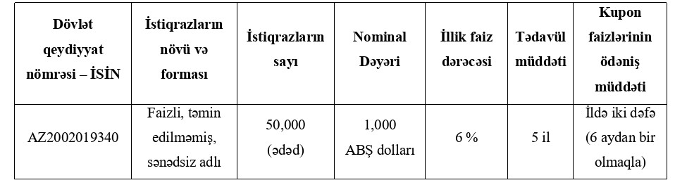 Faizli, təmin edilməmiş, sənədsiz adlı istiqrazların sayı 50 000 ədəd, hər birinin nominal dəyəri 1000 ABŞ dolları, faiz dərəcəsi 6%, tədavül müddəti 5 ildir. Kupon faizləri ildə 2 dəfə ödəniləcək.