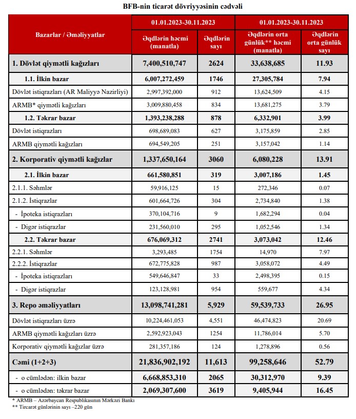 2023-cü ilin 11 ayı ərzində BFB-nin 21 milyard 836 milyon 902 min manatlıq cəmi dövriyyasinin təxminən 93%-i və ya 20 milyard 217 milyon 895 min manatı dövlət qiymətli kağızları ilə (dövlət istiqrazları və Mərkəzi Bankın notları) əməliyyatların (ilkin, təkrar və repo) hesabına formalaşıb.