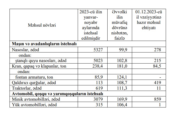 Dövr ərzində əvvəlki ilin müvafiq dövrü ilə müqayisədə traktorların istehsalı 11,3 faiz artaraq 619 ədəd, yük avtomobillərinin istehsalı isə 6,4% artaraq 315 ədəd təşkil edib.