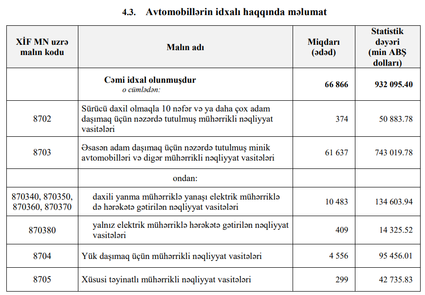 Xəbər verdiyimiz kimi, 2023-cü ilin yanvar-noyabr dövründə (11 ayda) Azərbaycana 1 milyard 522 milyon 373 min dollar dəyərində 88 min 738 ədəd nəqliyyat vasitəsi (avtomobil) idxal olunub. 2022-ci ilin yanvar-noyabr aylarında Azərbaycana 932 milyon 95 min dollar dəyərində 66 min 866 ədəd nəqliyyat vasitəsi idxal olunmuşdu. Azərbaycana 2023-cü ilin 11 ayında ötən ilin eyni dövrü ilə müqayisədə 21 min 872 ədəd və ya 32,7% daha çox avtomobil idxal edilib.