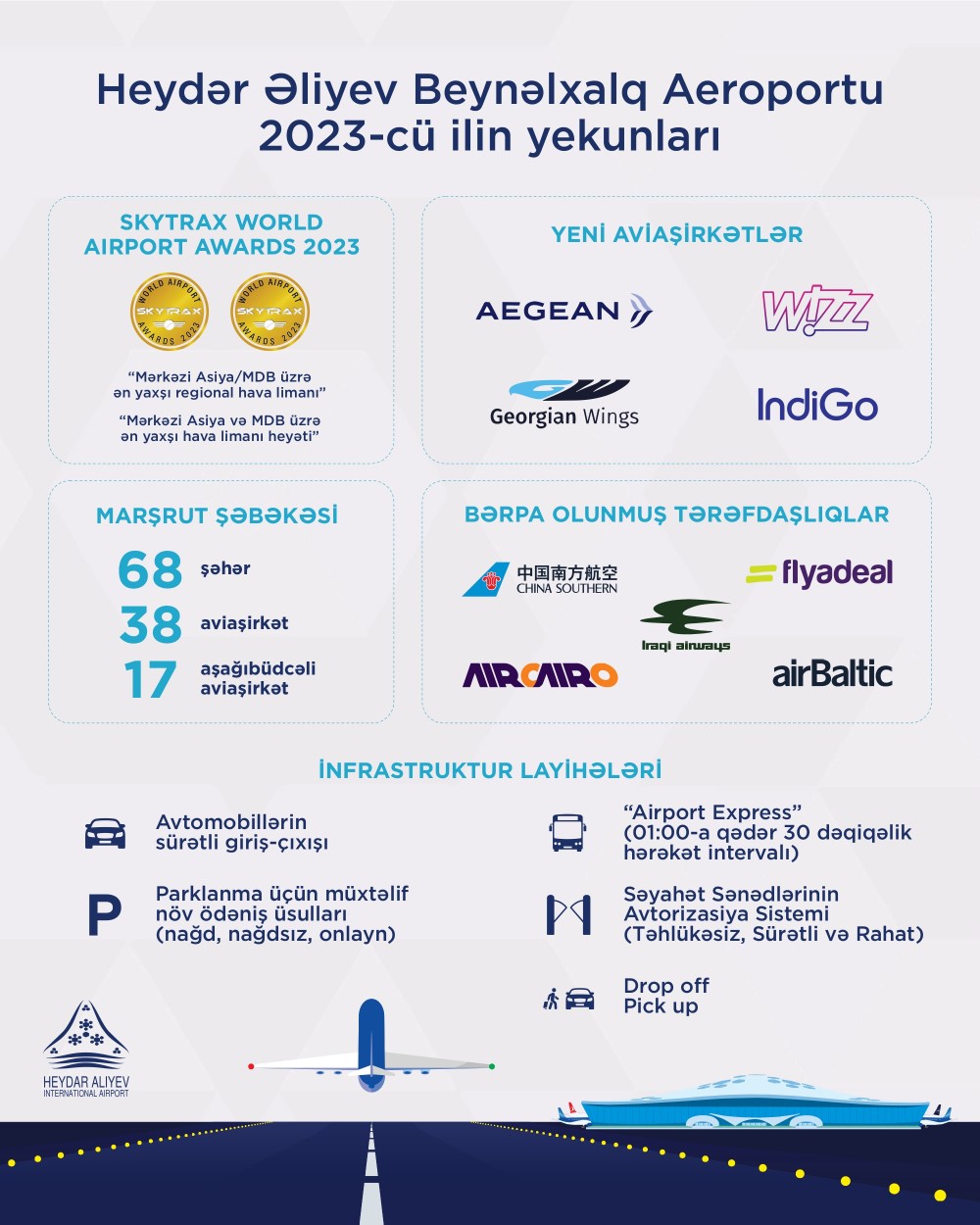 Mükafatlar: Heydər Əliyev Beynəlxalq Aeroportu “Skytrax World Airport Awards 2023” mükafatının “Mərkəzi Asiya/MDB-də ən yaxşı regional hava limanı” və ardıcıl ikinci dəfə “Mərkəzi Asiya və MDB məkanında ən yaxşı hava limanı işçisi” nominasiyaları üzrə qalibi olub.