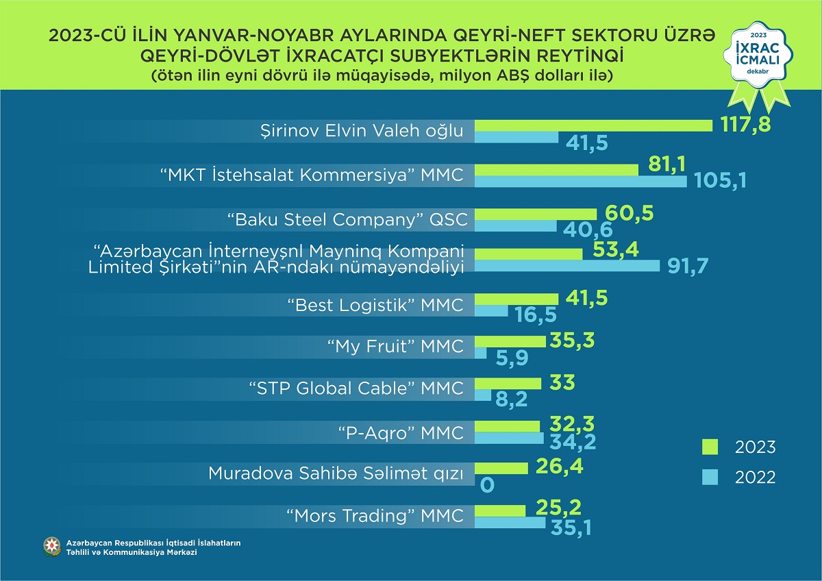 Marja.az xəbər verir ki, “İxrac icmalı” tərəfindən qeyri-neft sektoru üzrə 2023-cü ilin yanvar-noyabr aylarında (11 ay ərzində) həyata keçirilmiş ixracla bağlı həm qeyri-dövlət, həm də dövlətə məxsus ixracatçı subyektlərin reytinqi tərtib edilib.