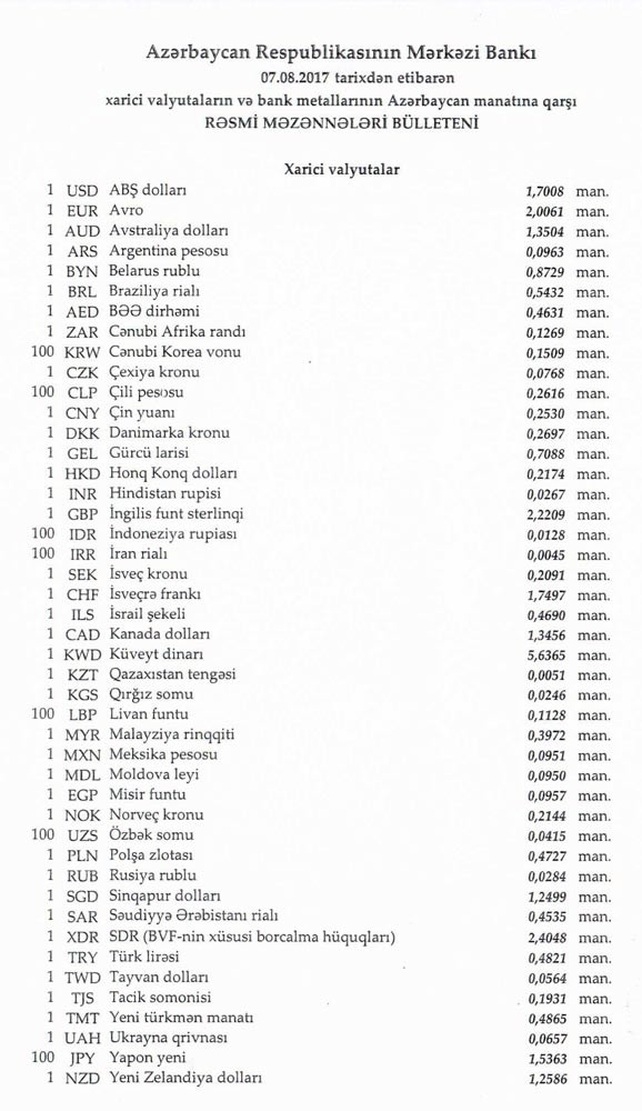 Avqustun 4-də rəsmi olaraq 1 dollar 1,7008 manata, 1 avro isə 2.0206 manata bərabər idi.