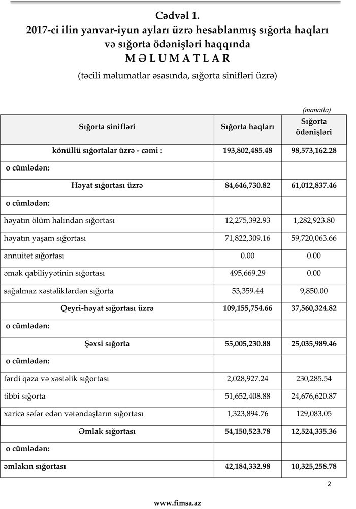 2017-ci ilin ilk rübü ərzində sığorta şirkətləri və sinifləri üzrə hesablanmış sığorta haqları və ödənişlərə dair ətraflı məlumatlar sığorta bazarının icmal göstəricilərində öz əksini tapıb.