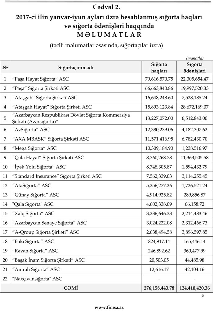 Qeyd edək ki, 2016-cı ilin yanvar-iyun ayları ərzində Azərbaycanın 25 sığorta şirkəti tərəfindən 285,35 milyon manat sığorta haqları hesablanmışdır. Bu, 2016-cı ilin anoloji dövrü ilə müqayisədə 9,19 milyon manat və ya 3,2% azdır.