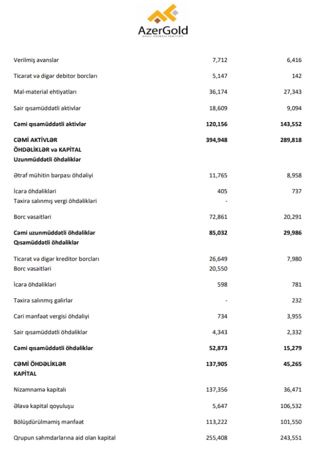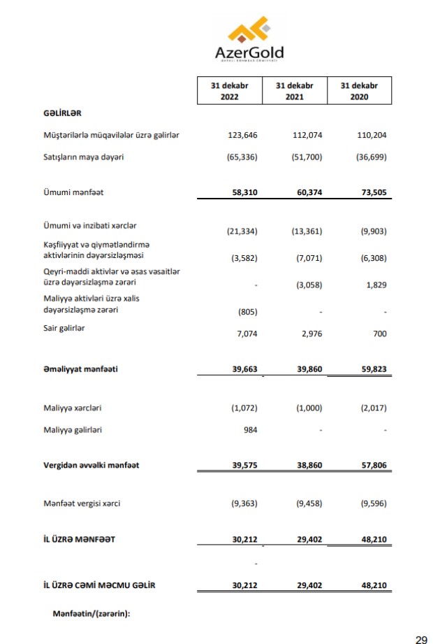 Marja.az "AzerGold" QSC-nin Konsolidə edilmiş mənfəət və ya zərər və sair məcmu gəlir haqqında hesabatına istinadən xəbər verir ki, Şirkətin gəlirləri 2022-ci ilin birinci yarısında (yanvar-iyun) 48 milyon 102 min dollar ikən, 2023-cü ilin birinci yarısında 40 milyon 357 min dollara düşüb (7 milyon 745 min dollar və ya 16,1% azalıb). Satışın maya dəyəri isə 5 milyon 535 min dollar və ya 17,1% artaraq 32 milyon 324 min dollara yüksəlib (2022-ci ilin ilk 6 ayında 26 milyon 789 min dollar təşkil etmişdi). Nəticədə, "AzerGold"un ümumi mənfəəti 2,7 dəfə azalaraq 8 milyon 33 min dollar təşkil edib (2022-ci ilin 6 ayında 21 milyon 312 min dollar təşkil etmişdi). Şirkətin ümumi və inzibati xərcləri isə 2 milyon 528 min dollar və ya 33,4% artaraq 10 milyon 87 min dollara yüksəlib.