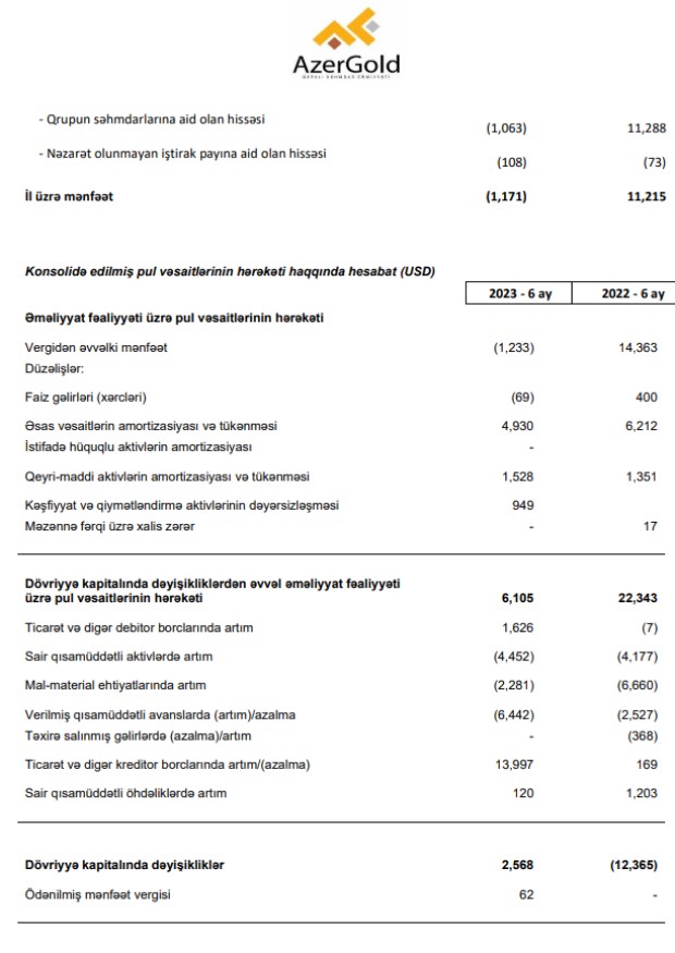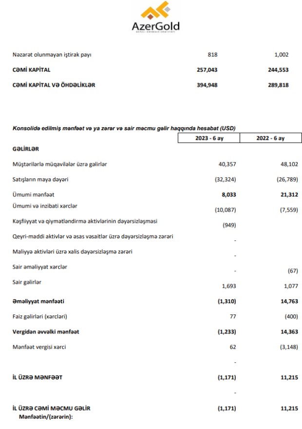 100% dövlətə məxsus "AzerGold" QSC 2023-cü ilin ilk 6 ayını 1 milyon 171 min dollar xalis zərər ilə başa vurub. Halbuki, şirkət 2022-ci ilin ilk 6 ayını 11 milyon 215 min dollar xalis mənfəət ilə bağlamışdı. "AzerGold" tam 2022-ci ildə isə 30 milyon 212 min dollar xalis mənfəət əldə etmişdi.