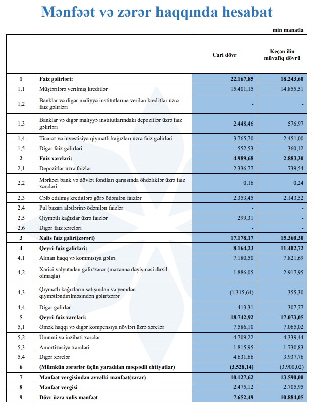 Ötən il "AFB Bank"ın faiz gəlirləri 21,5% arataraq 22 milyon 168 min manat, qeyri-faiz gəlirləri isə 28% azalaraq 8 milyon 164 min manat təşkil edib.