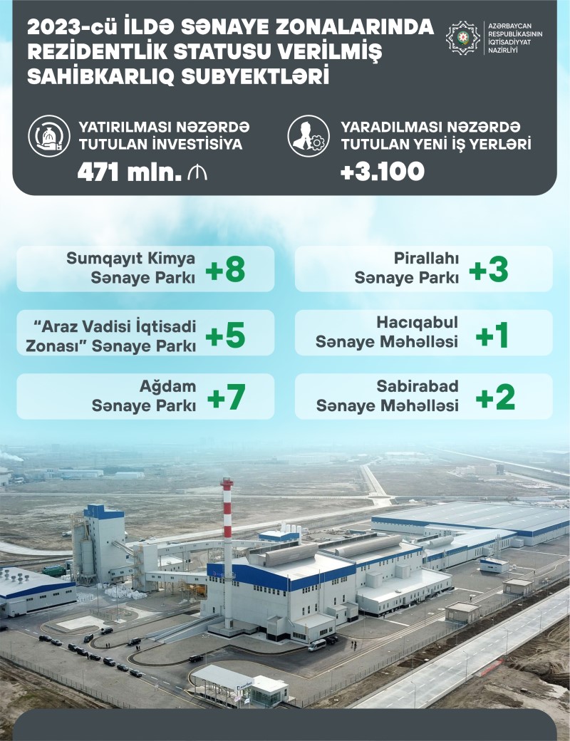 2023-cü ildə İqtisadi Zonaların İnkişafı Agentliyinin idarəçiliyində olan sənaye zonalarında 26 sahibkarlıq subyektinə rezidentlik statusu verilib.