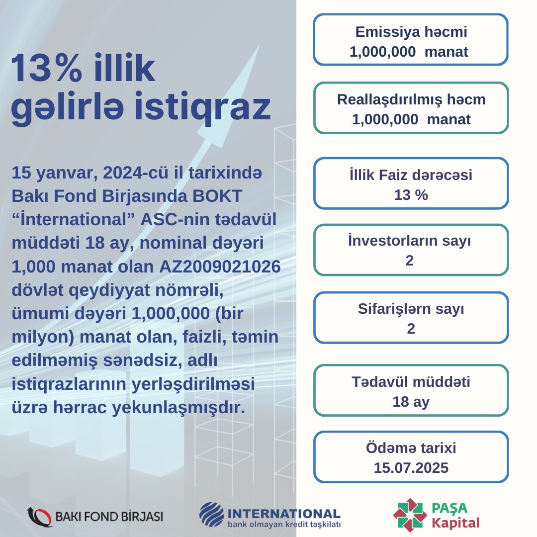 BOKT “İnternational” ASC-nin istiqrazlarının yerləşdirilməsi üzrə hərrac keçirilib.15 yanvar 2024-cü il tarixində Bakı Fond Birjasında BOKT “İnternational” ASC-nin tədavül müddəti 18 ay, nominal dəyəri 1000 manat olan AZ2009021026 dövlət qeydiyyat nömrəli, ümumi dəyəri 1 milyon manat olan, faizli, təmin edilməmiş sənədsiz, adlı istiqrazlarının yerləşdirilməsi üzrə hərrac yekunlaşıb.