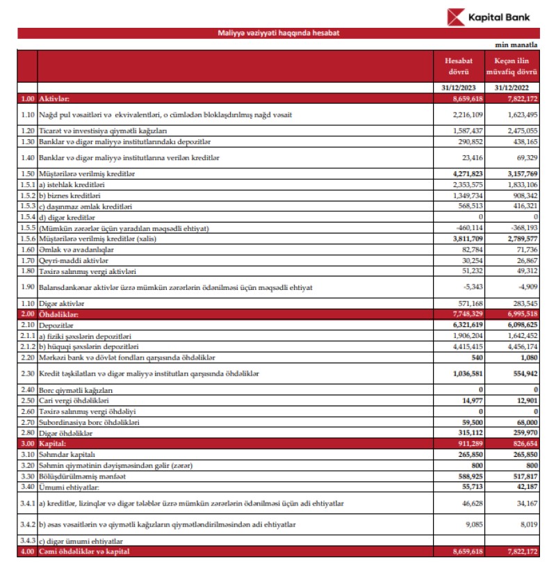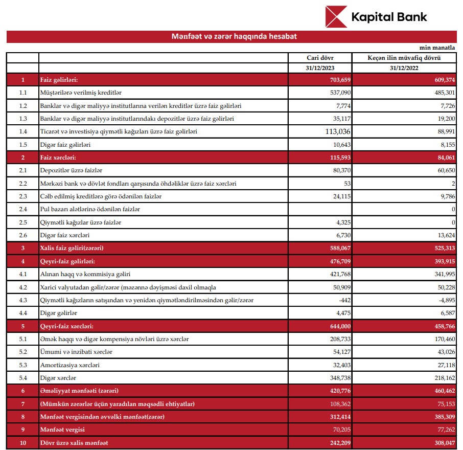 "Kapital Bank" ASC 2023-cü ili 242 milyon 209 min manat xalis mənfəət ilə başa vurub. Bank 2022-ci ili 308 milyon 47 min manat xalis mənfəət ilə bağlamışdı. Beləliklə, "Kapital Bank"ın xalis mənfəəti 2023-cü ildə 2022-ci illə müqayisədə 65 milyon 838 min manat və ya 21,4% azalıb. Xalis mənfəətin azalması xərclərin gəlirlərdən daha çox artması və mümkün zərərlər üçün yaradılan məqsədli ehtiyatlara daha çox vəsait ayrılması ilə əlaqədardır.