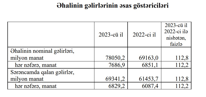 İlkin məlumatlara görə, 2023-cü il ərzində ölkə əhalisinin gəlirləri əvvəlki ilə nisbətən nominal ifadədə 12,8 faiz artaraq 78 milyard 50,2 milyon manata çatmışdır.