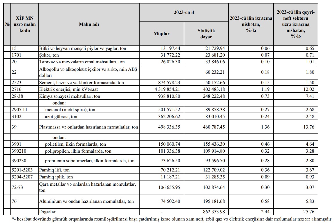 2023-cü ilin yanvar-dekabr aylarında (12 ayda) Azərbaycanın ən çox ixrac və idxal etdiyi mallar.
