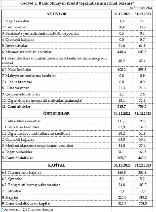 Bank olmayan kredit təşkilatlarının cəmi aktivləri 2022-ci ilin sonunda 515,7 milyon manat ikən, 31 dekabr 2023-cü il tarixində 758,5 milyon manat təşkil edib (ötən il 242,8 milyon manat artıb).